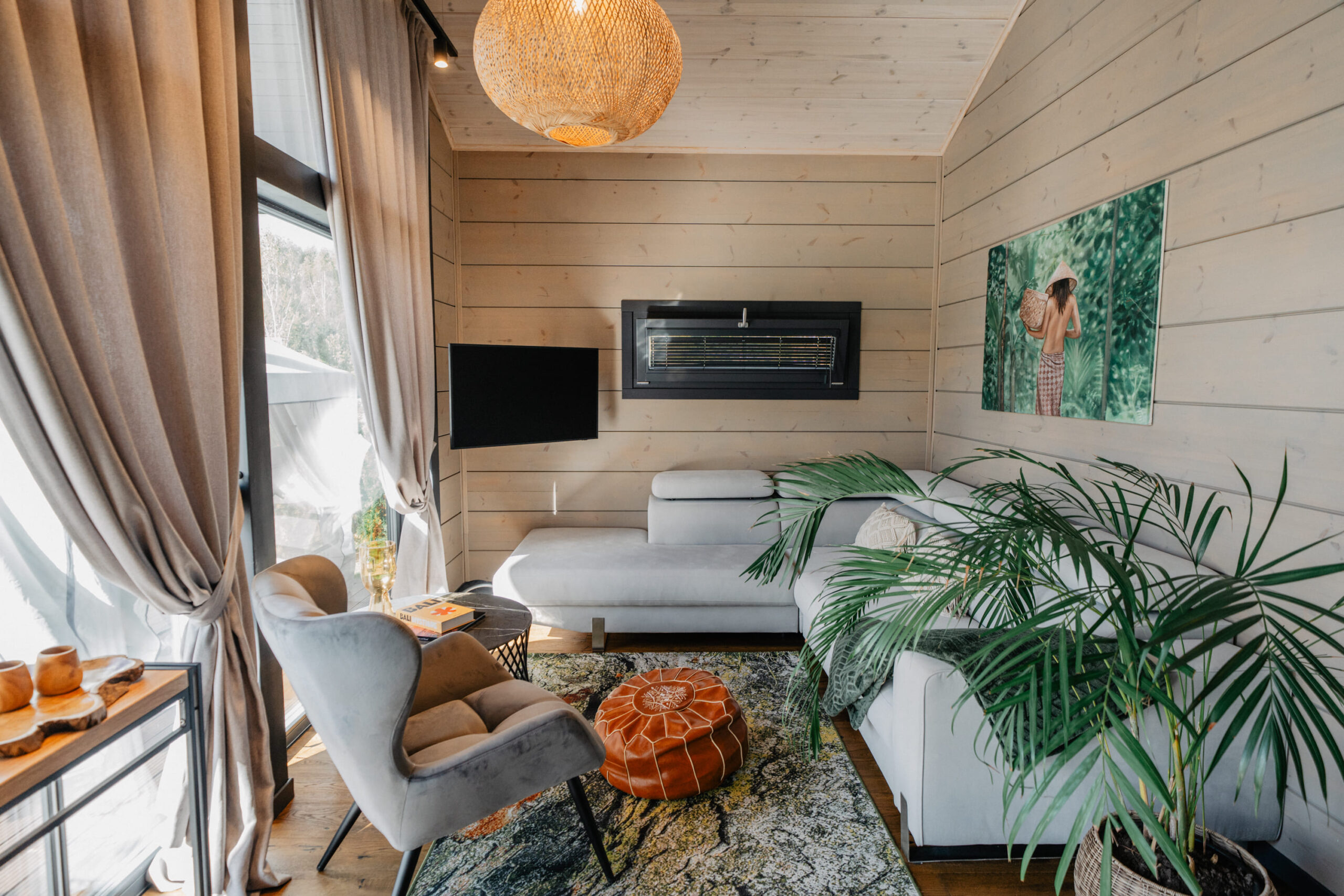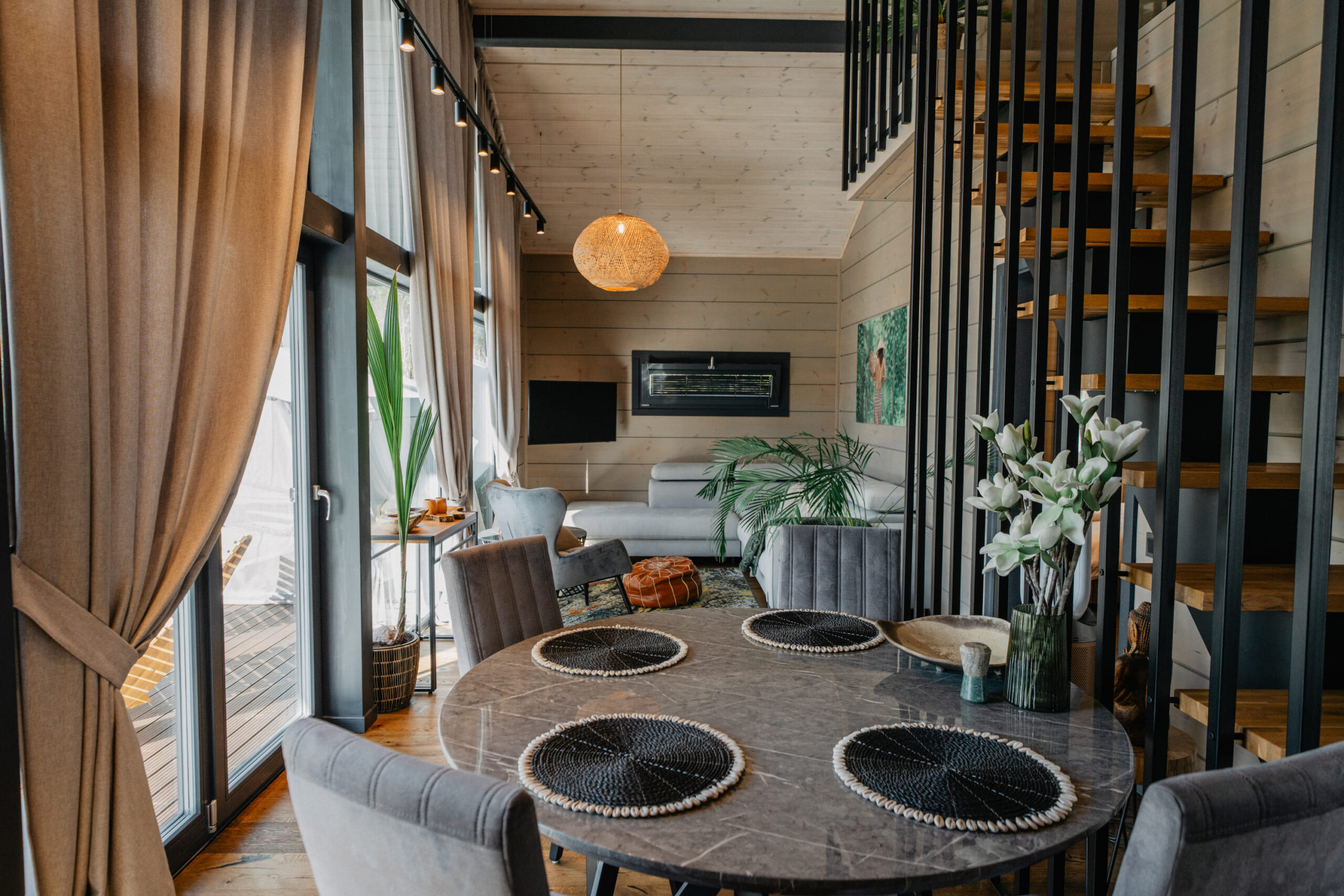 Natural wood, rattan, deep green accents and plenty of plants create the feeling of a private jungle retreat by the water, with softer light and earthy tones for those who like a cosy, enveloping space.