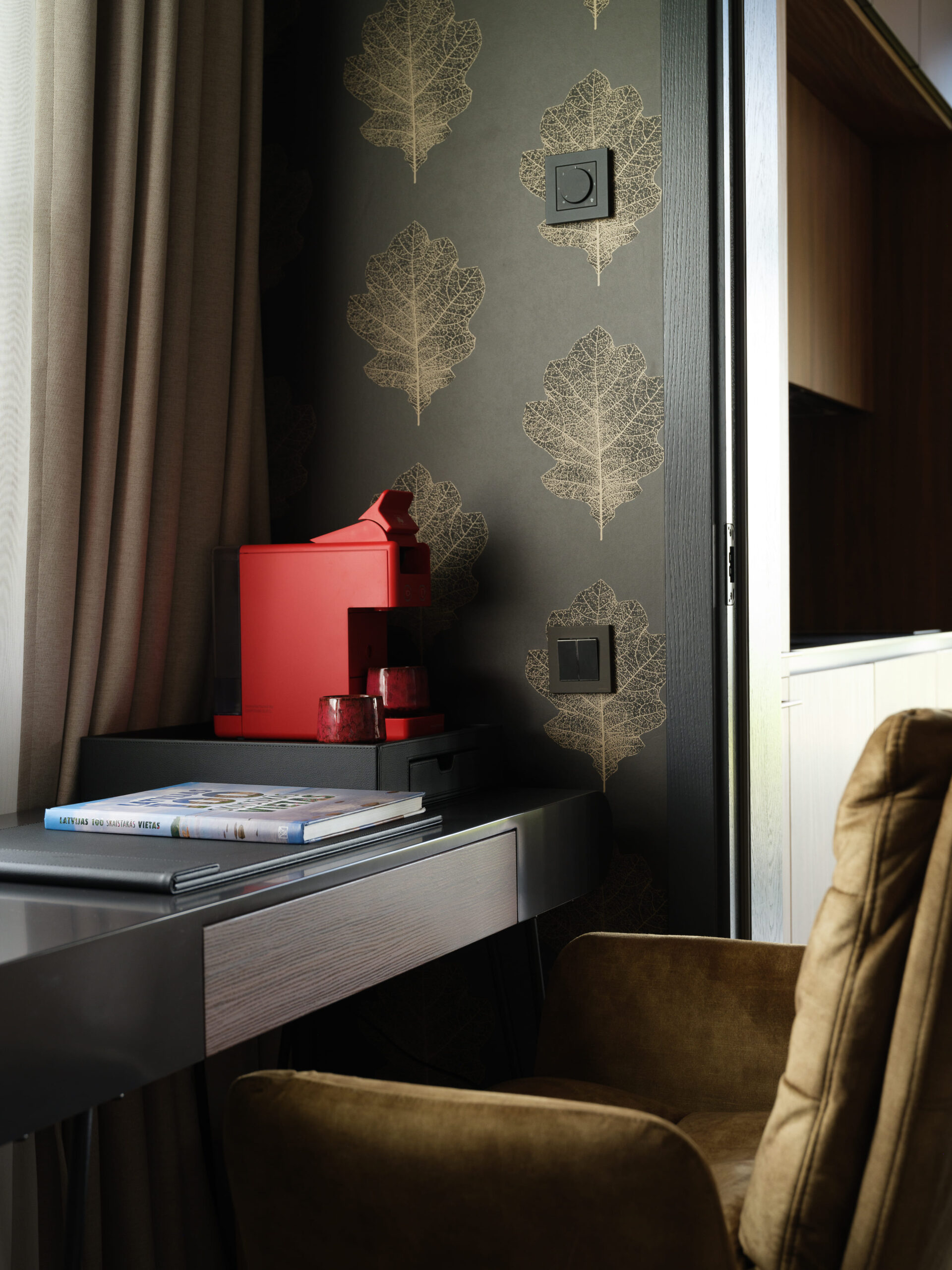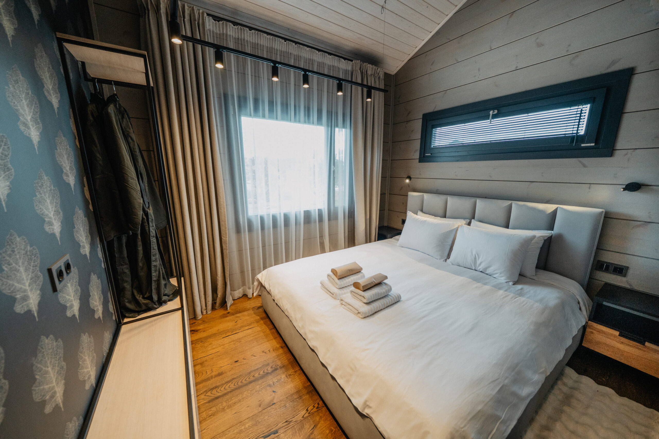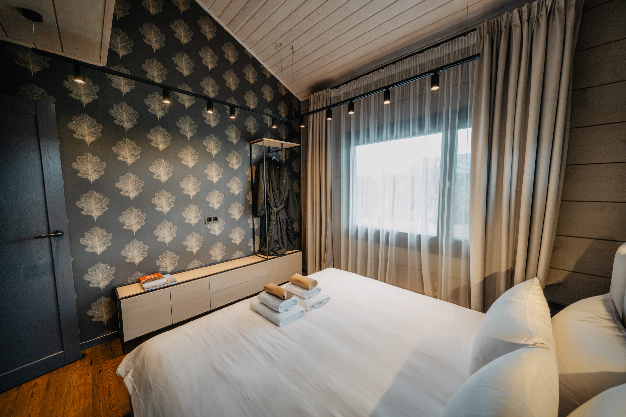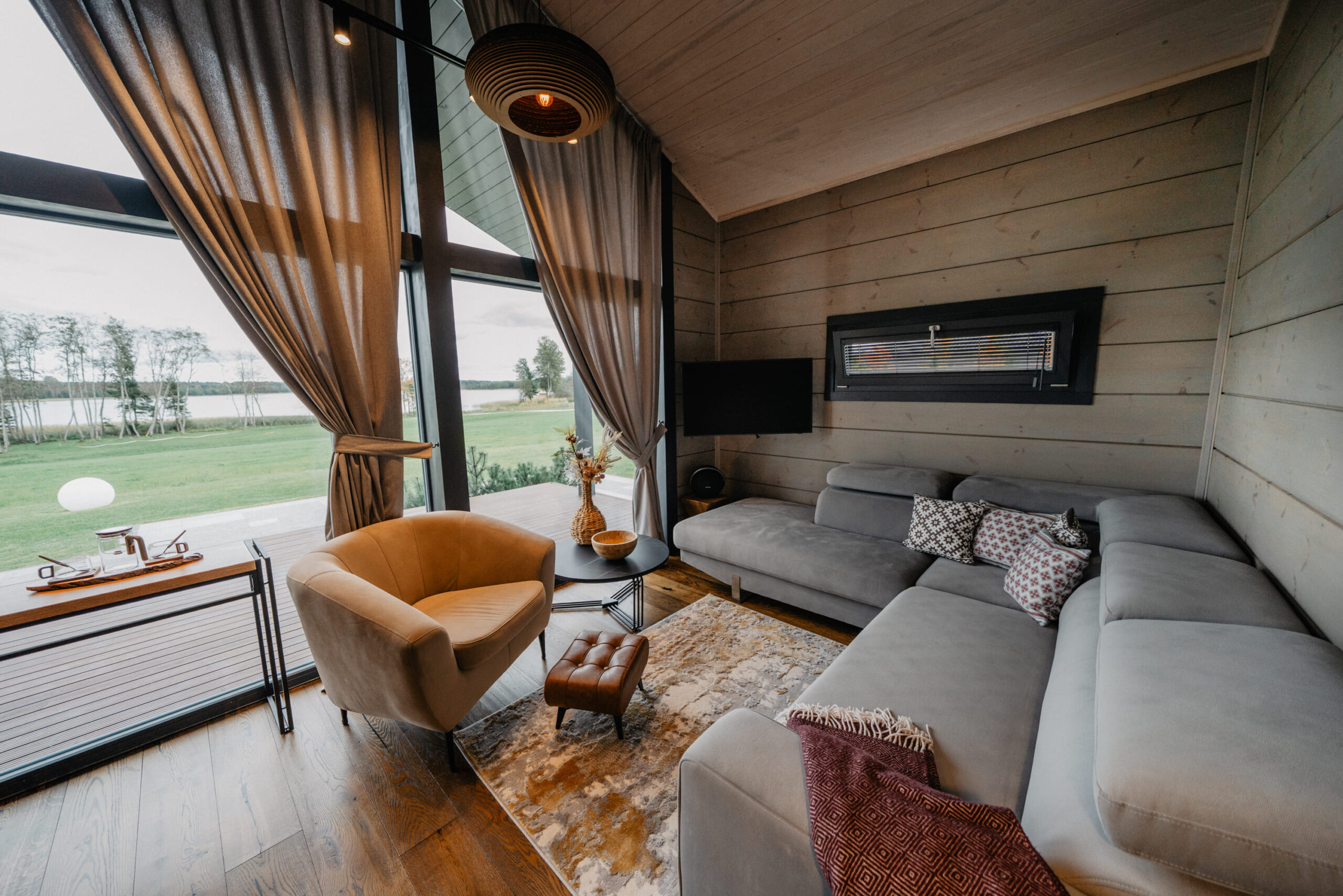 Warm wood, soft textiles and graphic leaf patterns create a cosy northern feel, with large windows opening directly towards Lake Plaužu for those who like quiet views and a sense of home.
