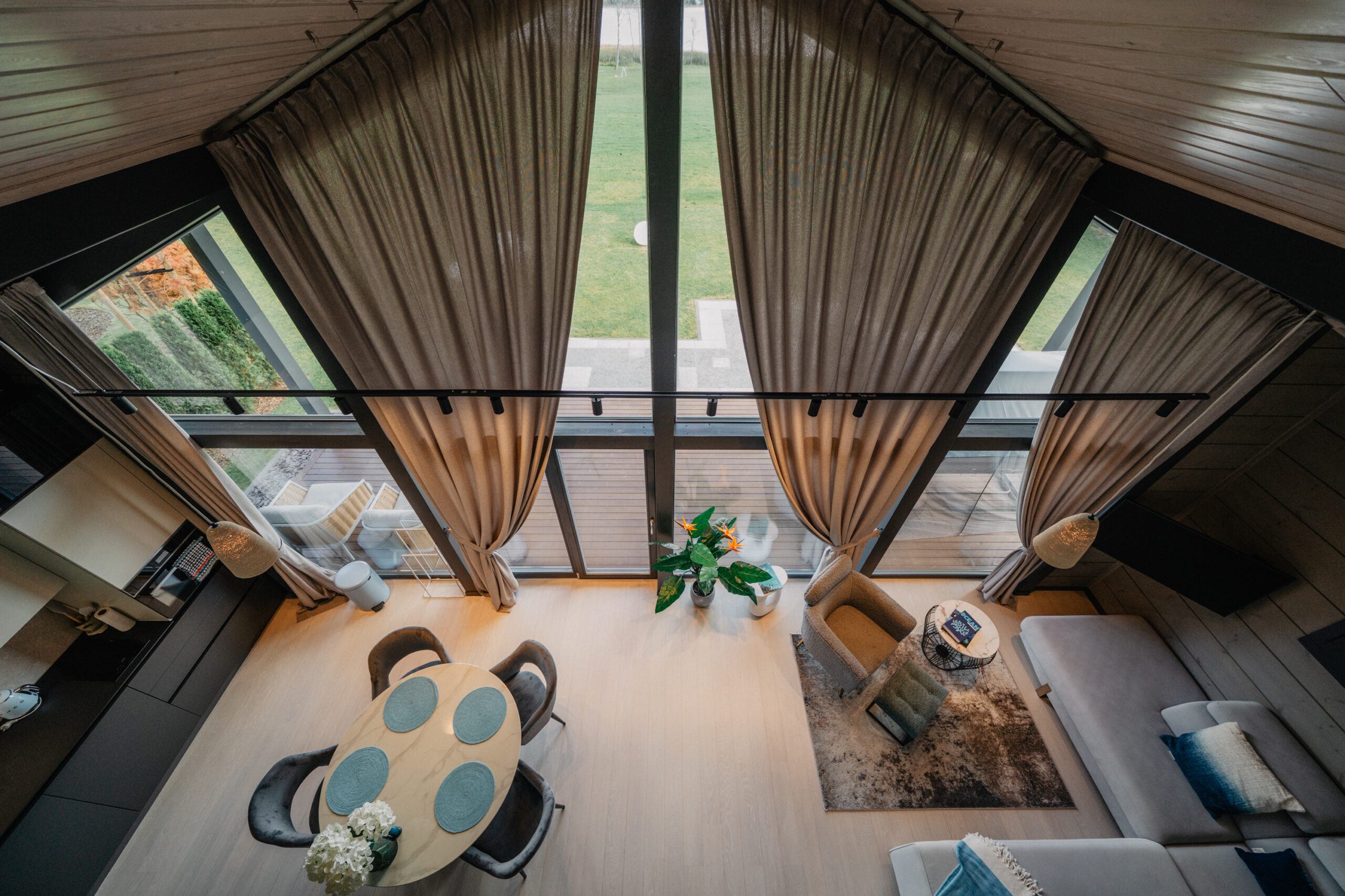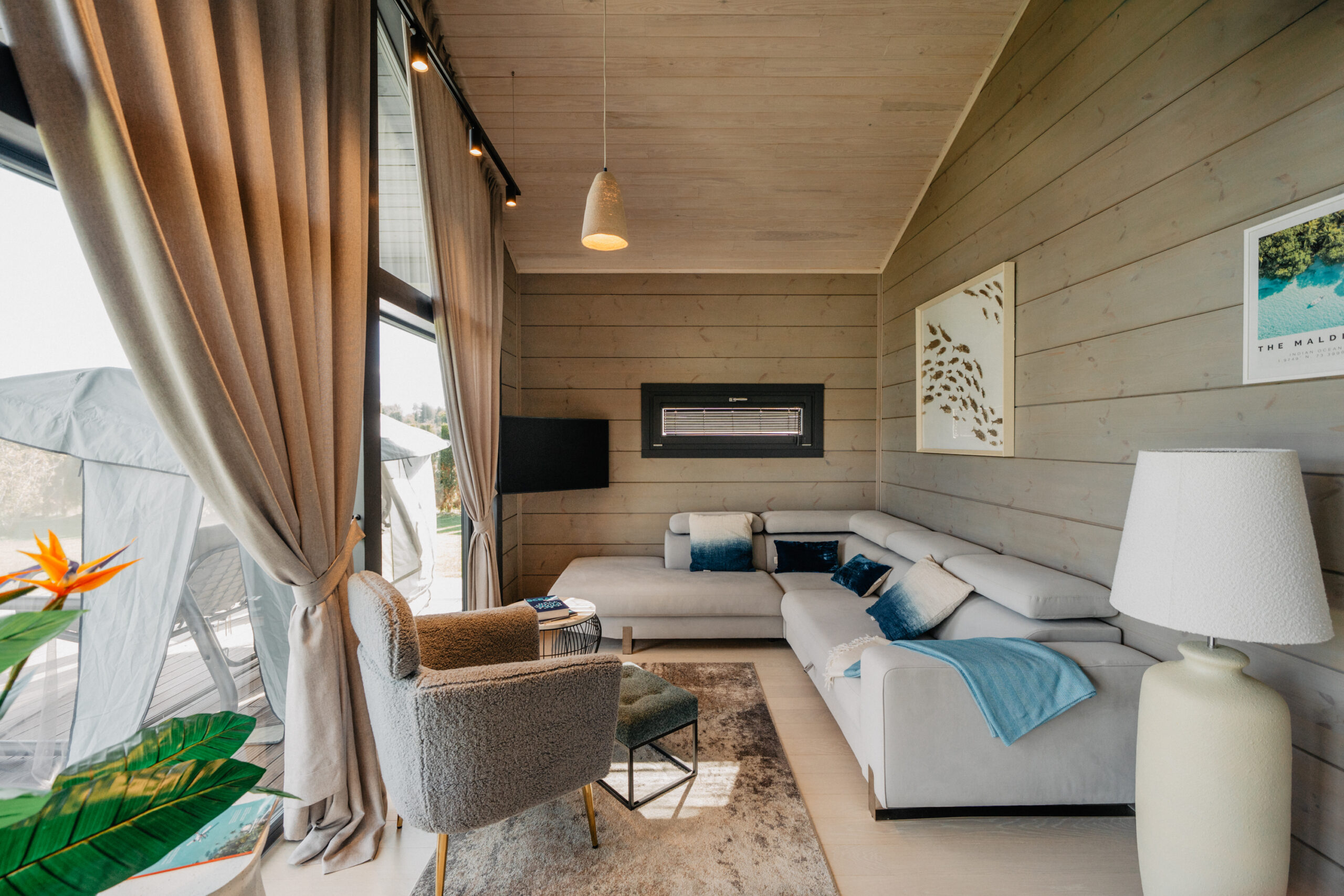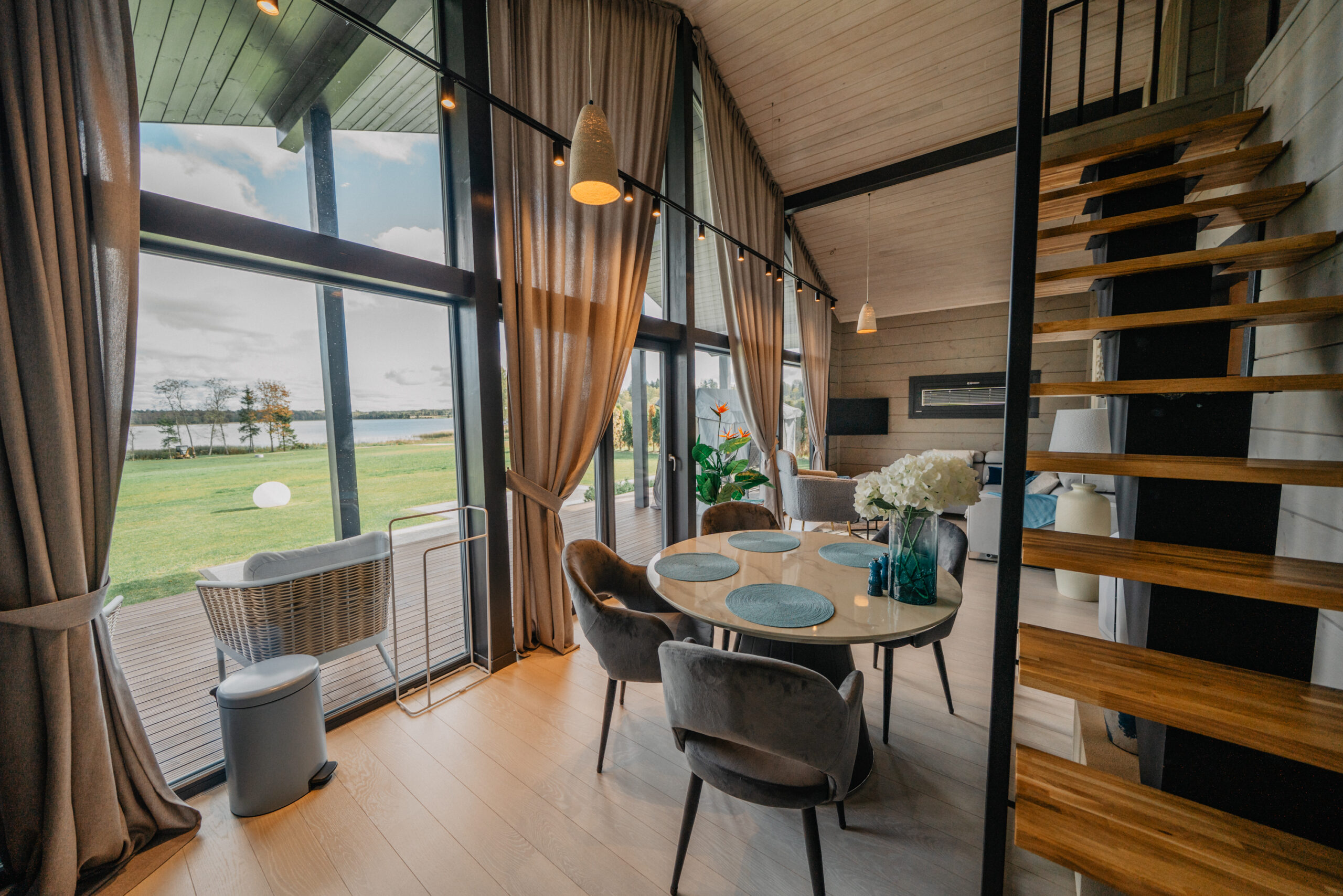 Soft sand tones, pale wood and turquoise details bring in a quiet island feeling, with floor-to-ceiling windows opening towards the lake.